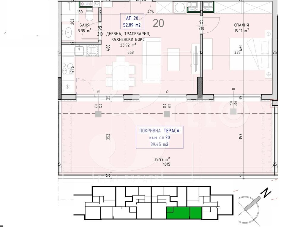 РЗП на апартамента - 61кв.м. и ЗП53 кв.м.+40 кв.м. тераса. Разпределението на апартамента е както следва: просторен хол с кухненски бокс и трапезария , спалня , тераса, баня с тоалетна, склад.
