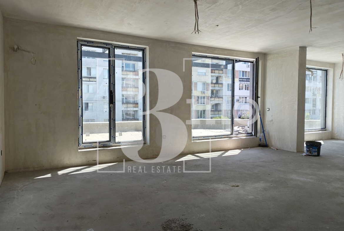 Агенция ТРИМО ИМОТИ - офис Амалтея продава тристаен апартамент в нова сграда с Акт 14 и срок на завършване м. май 2026 г. Жилището е със застроена площ 99,44 кв.м., обща площ 115,32 кв.м., с прилежаща покривна тераса с площ 61,13 кв.м., намира се на шести - последен етаж, с изложение югоизток-югозапад-северозапад-североизток. Състои се от дневна с кухня (41,10 кв.м.), две спални (11,68 кв.м. и 12,12 кв.м.), дрешник (3,72 кв.м.), баня с тоалетна (4,35 кв.м.), тоалетна (2,19 кв.м.), антре (4,50 кв.м.) и коридор (4,37 кв.м.) и голяма тераса (61,13 кв.м.).