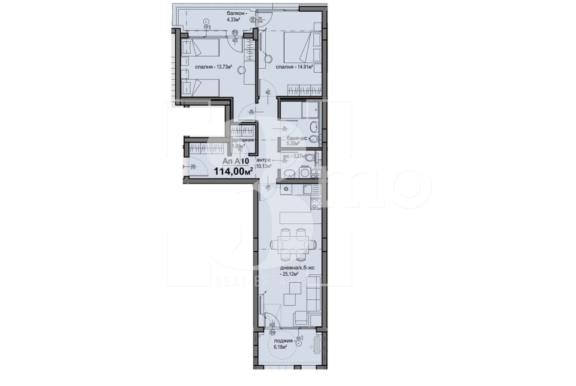 3mo Амалтея има удоволствието да Ви предложи тристаен апартамент в нова модерна жилищна сграда с планирано разрешение за ползване в края на 2026-та година. Намира се в ж.к. Люлин 5 на комуникативно място. Предложеният имот е с обща площ от 114 кв.м. (застроена 101,41 кв.м.) и се състои от: входно антре (10,13 кв.м.), всекидневна с кухненски бокс и трапезария (25,12 кв.м.) с лоджия (6,18 кв.м.), спалня (14,91 кв.м.), втора спалня (13,73 кв.м.), балкон (4,33 кв.м.), дрешник/складово помещение (1,99 кв.м.), баня с тоалетна (5,30 кв.м.) и самостоятелна тоалетна (3,27 кв.м). Жилището е разположено на втори от общо девет етажа с изложение изток и запад. Отоплението е чрез Газ. Към имота може да се закупи паркомясто или гараж. Инвеститорът е с богат опит, специализиран в изграждането на качествени жилищни сгради, като прилага най-новите технологии и иновации в строителството. В близост до имота са разположени множество търговски, хранителни и денонощни магазини и обекти. Също така детска градина, училище и удобен градски транспорт с бърз превоз до метростанции Люлин, Западен парк и Сливница. Връзката с централната и други части на столицата се осъществява посредством бул. Петър Дертлиев, бул. Добринова скала и Околовръстен път. Агенцията ни предлага безплатна консултация и съдействие на своите клиенти при покупка на имот чрез ипотечен кредит. За повече информация и организиране на огледи, моля свържете се с нас на посочените телефони!
