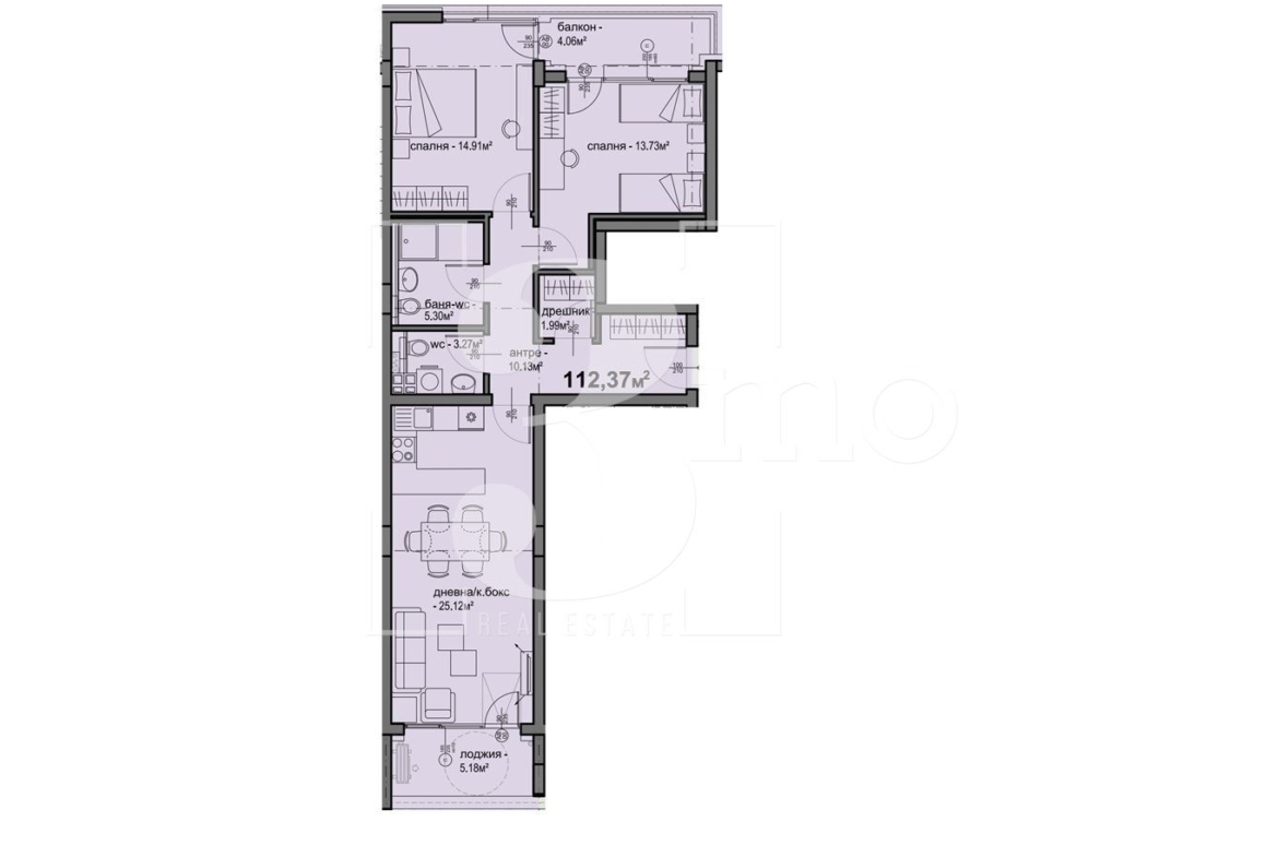 3mo Амалтея има удоволствието да Ви предложи тристаен апартамент в нова модерна жилищна сграда. Планирано разрешение за ползване в края на 2026-та година. Намира се в ж.к. Люлин 5 на комуникативно място. Предложеният имот е с обща площ от 112,37 кв.м. (застроена 100 кв.м.) и се състои от: входно антре (10,13 кв.м.), всекидневна с кухненски бокс и трапезария (25,12 кв.м.) с лоджия (5,18 кв.м.), спалня (14,91 кв.м.), втора спалня (13,73 кв.м.), балкон (4,06 кв.м.), дрешник/складово помещение (1,99 кв.м.), баня с тоалетна (5,30 кв.м.) и самостоятелна тоалетна (3,27 кв.м). Жилището е разположено на втори от общо девет етажа с изложение изток и запад. Отоплението е чрез Газ. Към имота може да се закупи паркомясто или гараж. Инвеститорът е с богат опит, специализиран в изграждането на качествени жилищни сгради, като прилага най-новите технологии и иновации в строителството. В близост до имота са разположени множество търговски, хранителни и денонощни магазини и обекти. Също така детска градина, училище и удобен градски транспорт с бърз превоз до входовете на метростанции Люлин, Западен парк и Сливница. Връзката с централната и други части на столицата се осъществява посредством бул. Петър Дертлиев, бул. Добринова скала и Околовръстен път. Агенцията ни предлага безплатна консултация и съдействие на своите клиенти при покупка на имот чрез ипотечен кредит. За повече информация и организиране на огледи, моля свържете се с нас на посочените телефони!