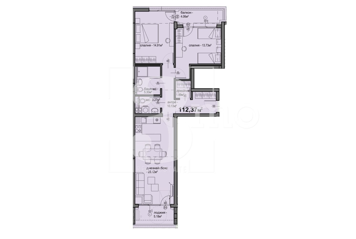 3mo Амалтея има удоволствието да Ви предложи тристаен апартамент в нова модерна жилищна сграда. Планирано разрешение за ползване в края на 2026-та година. Намира се в ж.к. Люлин 5 на комуникативно място. Предложеният имот е с обща площ от 112,37 кв.м. (застроена 100 кв.м.) и се състои от: входно антре (10,13 кв.м.), всекидневна с кухненски бокс и трапезария (25,12 кв.м.) с лоджия (5,18 кв.м.), спалня (14,91 кв.м.), втора спалня (13,73 кв.м.), балкон (4,33 кв.м.), дрешник/складово помещение (1,99 кв.м.), баня с тоалетна (5,30 кв.м.) и отделна тоалетна (3,27 кв.м). Жилището е разположено на осми от общо девет етажа. Има изложение изток и запад. Отоплението е чрез Газ. Към имота може да се закупи паркомясто или гараж. В същата сграда и в района продаваме най-разнообразни апартаменти.