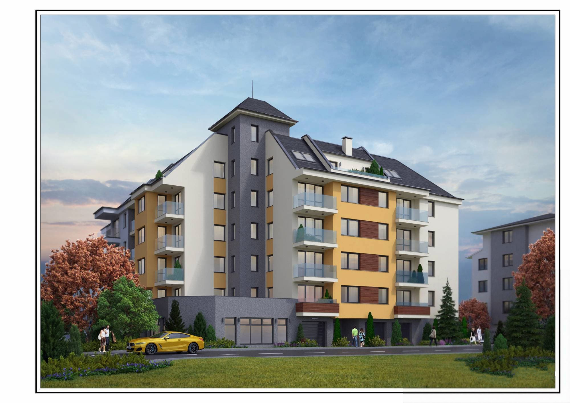 Сградата е на шест етажа и в нея предлагаме апартаменти - 11 двустайни, 7 тристайни, 1 четиристаен, 1 петстаен (мезонет), два магазина на партерно ниво, 1 паркомясто, 12 подземни и 3 наземни гаражи.